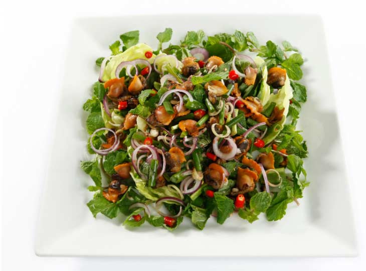 Gỏi Thái sò huyết là món ăn đặc trưng của xứ chùa vàng. Sò huyết kiểu thái với nguyên liệu chính là những con sò huyết béo múp được trụng sơ vẫn còn giữ được trọn vẹn cả hương vị lẫn chất dinh dưỡng, các loại rau củ và miến kết hợp với nhau tạo nên hương vị thơm ngon.